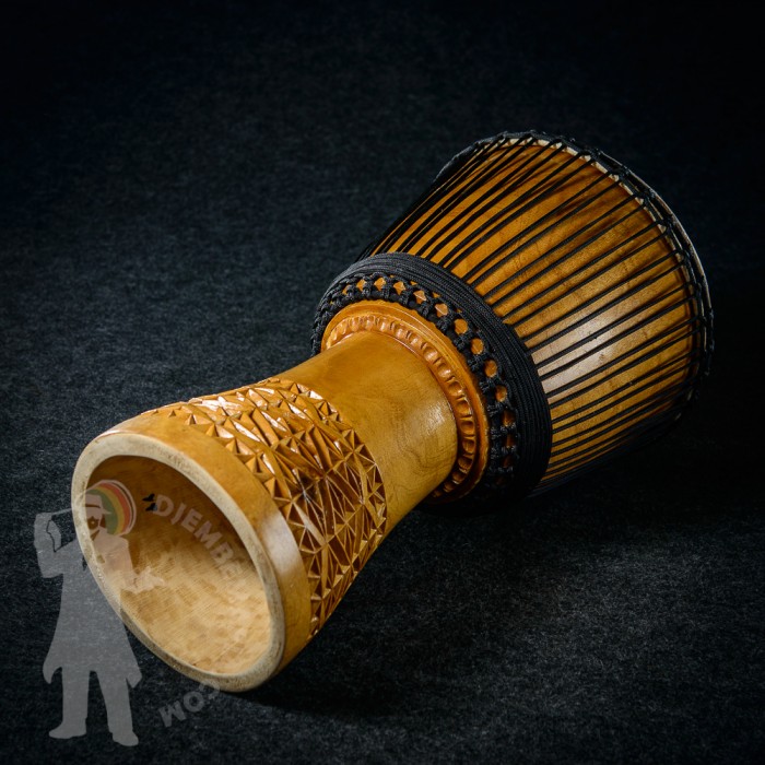 Profesionální africký buben djembe z Mali na prodej. Umělecká řezba na noze bubnu. Vyroben ručně z tvrdého dřeva. Kvalitní evropské vysokopevnostní provazy. Prvotřídní malijská koz kůže. Silný čistý plný zvuk zvuk s velkými rozdíly mezi jednotlivými údery.