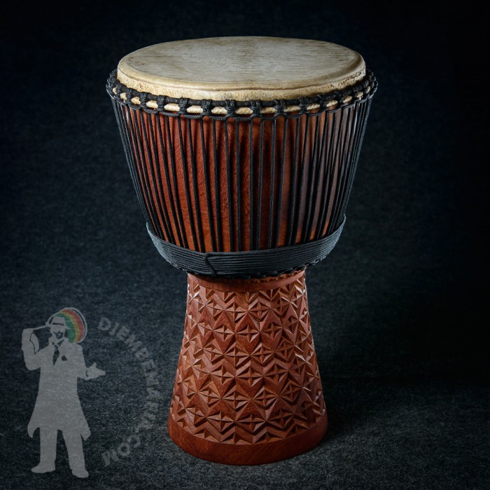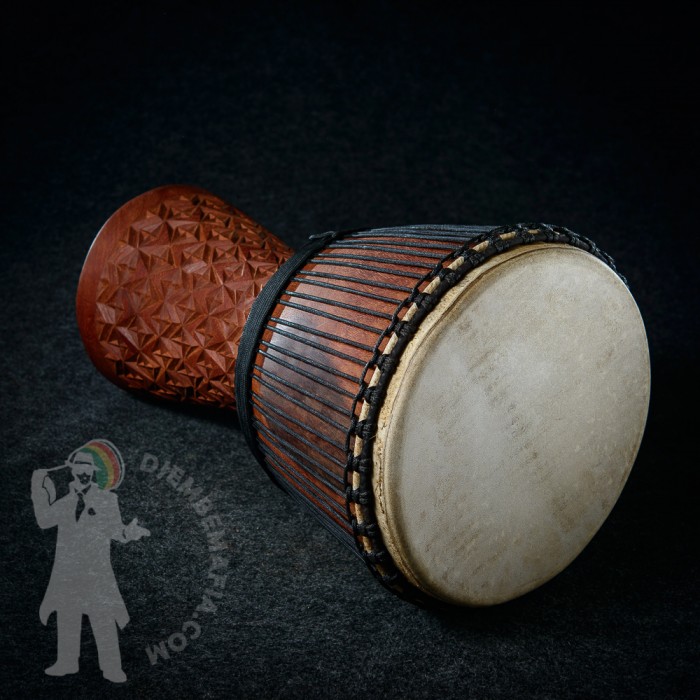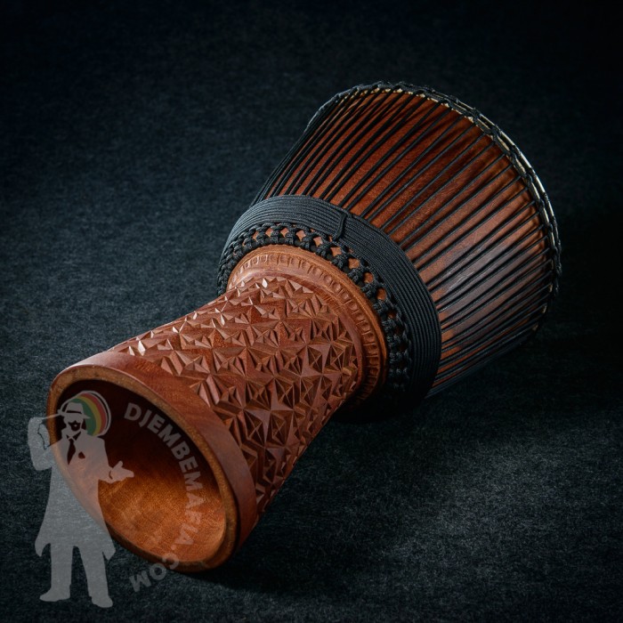 Profesionální africký buben djembe z Mali na prodej. Umělecká řezba na noze bubnu. Vyroben ručně z tvrdého dřeva. Kvalitní evropské vysokopevnostní provazy. Prvotřídní malijská koz kůže. Silný čistý plný zvuk zvuk s velkými rozdíly mezi jednotlivými údery.