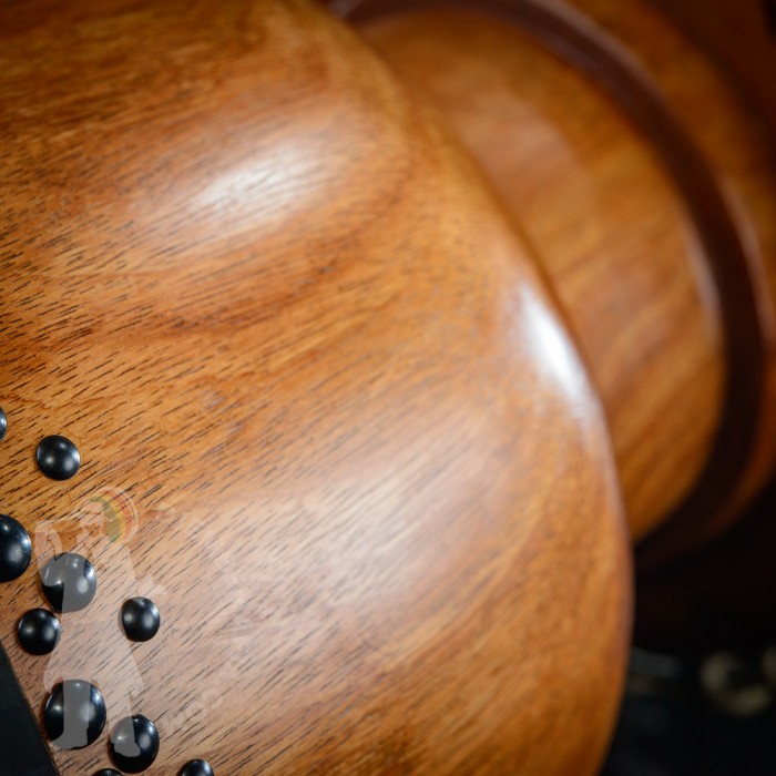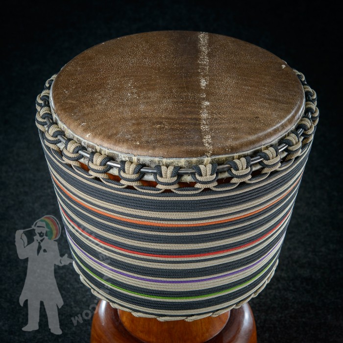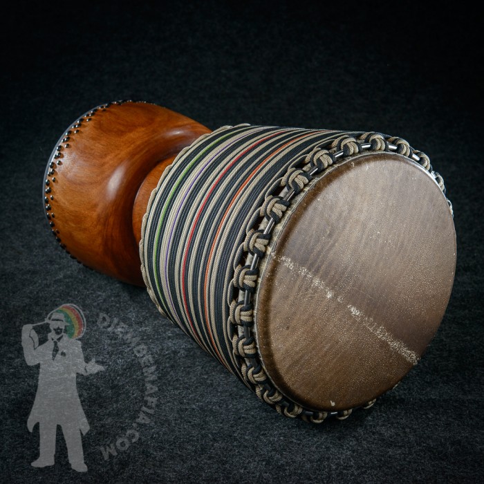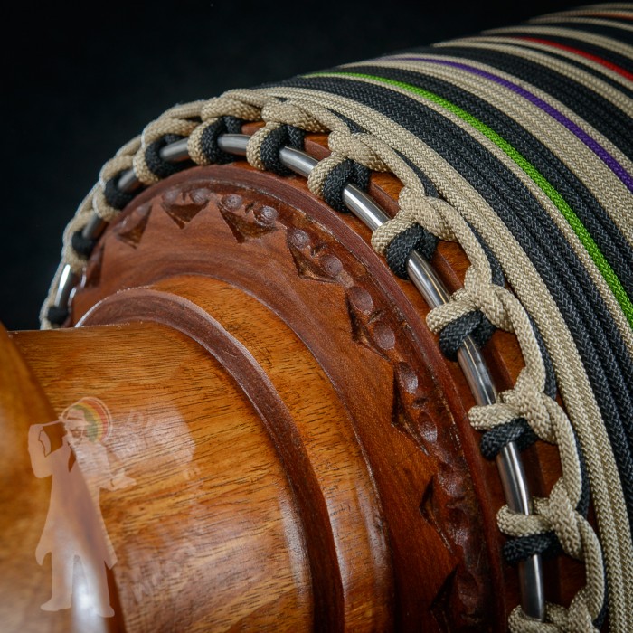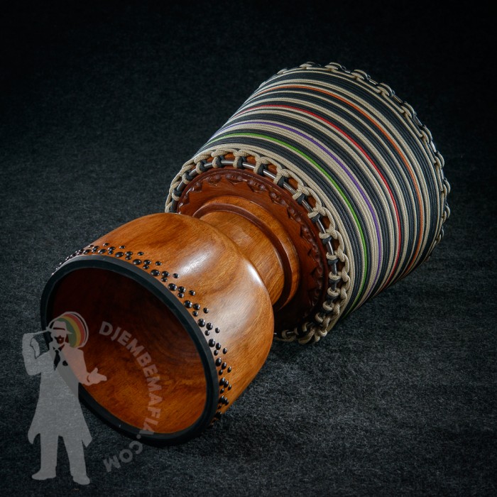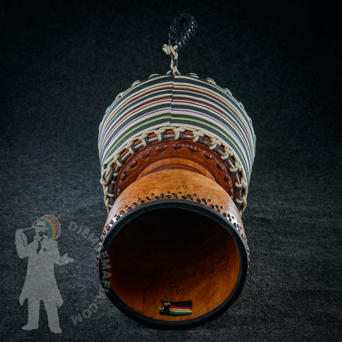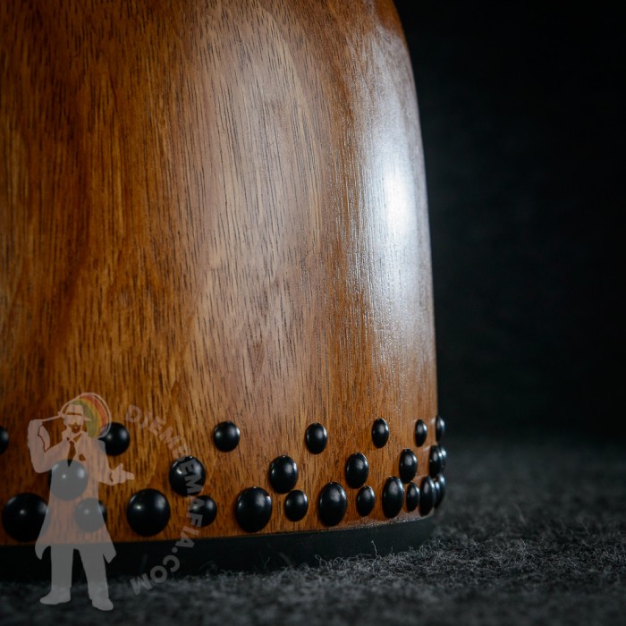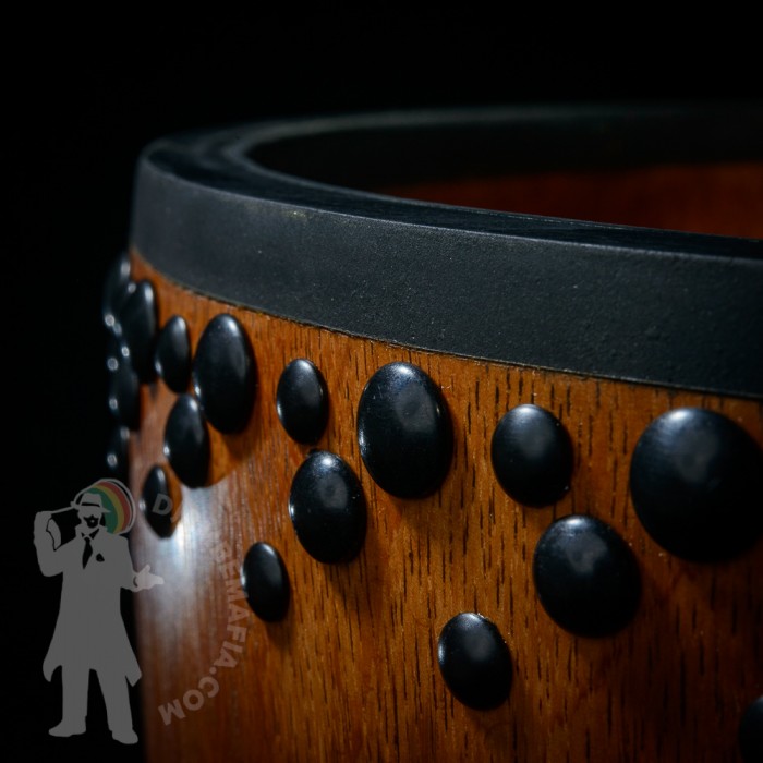 Profesionální africký buben djembe na prodej! Djembemafia original tvar bubnu djembe typu Bambara. Vyroben ručně z jádrového mahagonového dřeva lenké. Potažen premiovou bůvolí kůží. Djembemafia original černé dekorativní hřebíčky. Perfektní specifický zvuk pro bůvolí kůži s velmi hlubokými dutými tony a penetrujícími slapy. Nerezové obroučky, protiskluzná protekční gume.