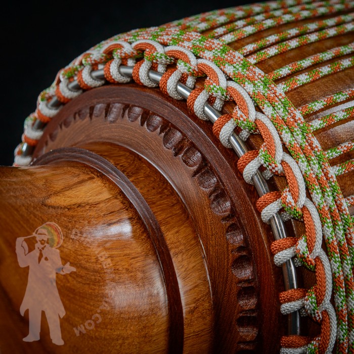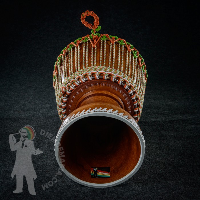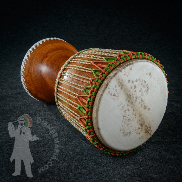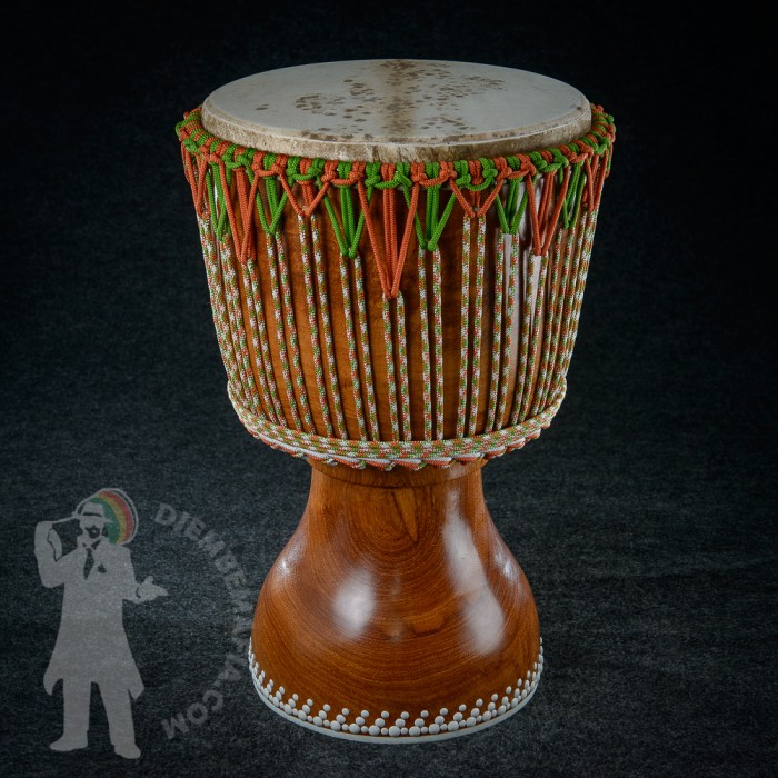 Professional djembe drum for sale. Handcarved from Lenké heartwood. Djembemafia original unique rope work, white tackless rubberfoot and brand new white decorative tackwork scheme! Unique Djembemafia glass like woodcare applied! Mounted with perfect spotted extra thick malian goat skin and tuned to the max! Ultimate looking and sounding djembe drum! Collector piece !