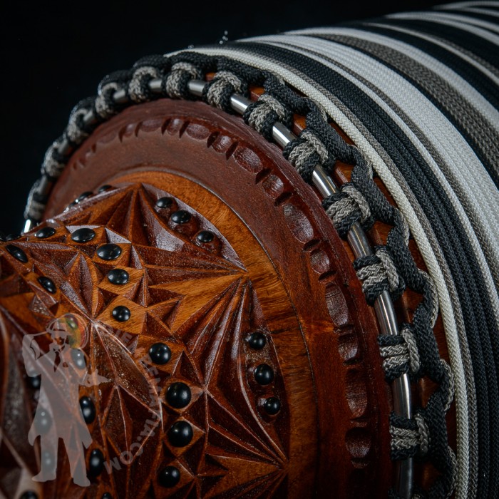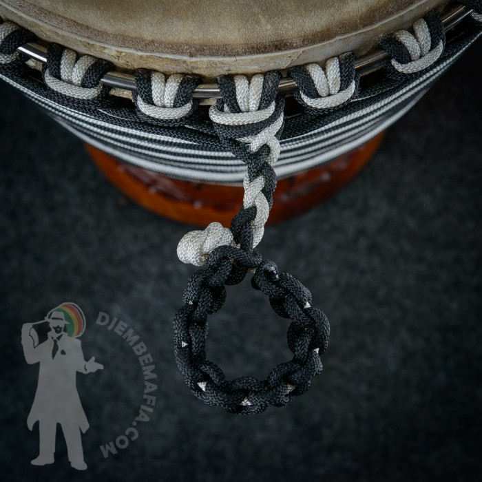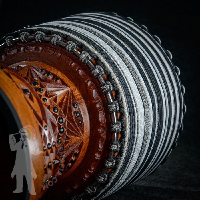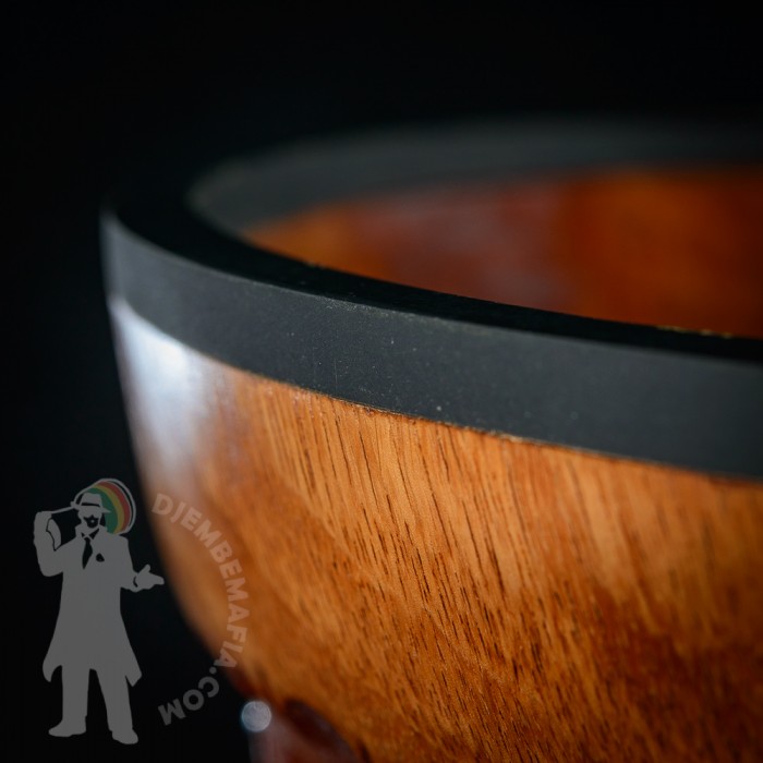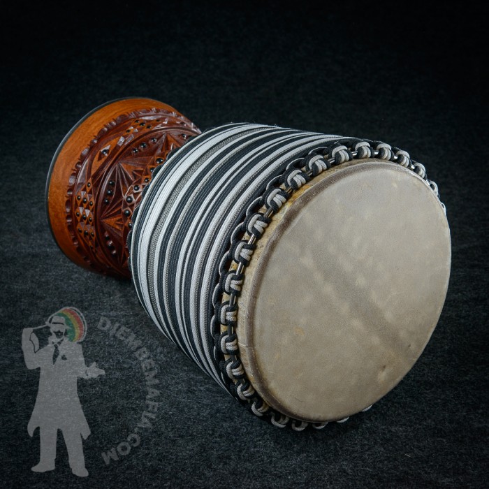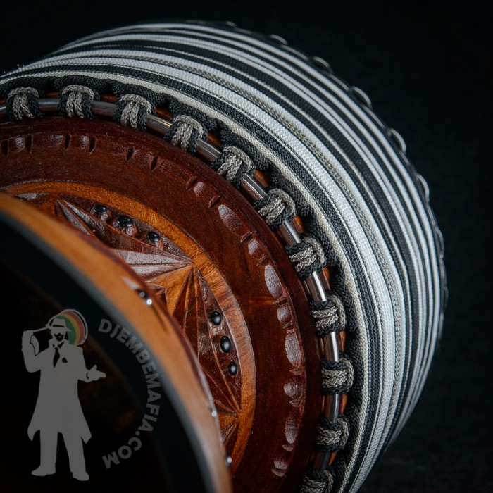 Professional djembe drum for sale. Djembemafia original djembe drumn shape called NSG Mounted with exclusive deer skin! Very specific melodic sound! Highly polished stainless steel rings, tackless rubberfoot, Pro Grip handle. Handcarved from Lenké heartwood. Djembemafia original black decorative tackwork. Beautiful looking and sounding exclusive djembe drum!